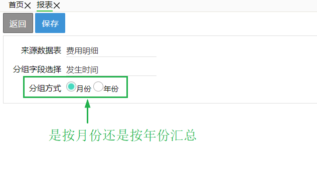 分组字段选择:当前报表关联表格用于分组的字段